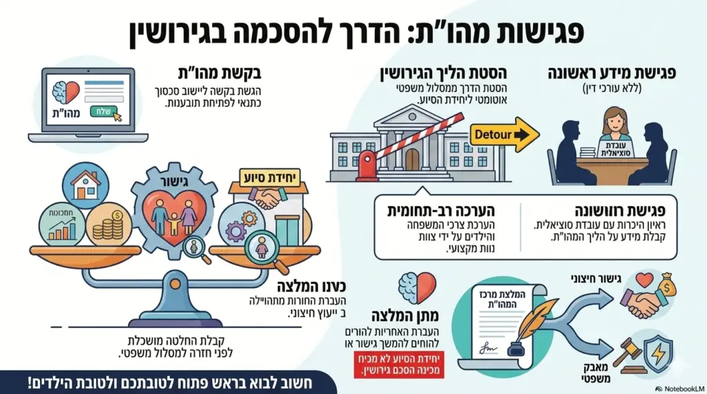 פגישת מהו"ת היא שלב משמעותי בהליכי אחריות הורית וגירושין, וההמלצות של מרכז מהו"ת משפיעות ישירות על ההחלטות של בית המשפט לענייני משפחה. ככל שתבינו טוב יותר מה זה מהו"ת, מה קורה בפגישות מהו"ת, ואיך הליך מהו"ת מתחבר לבקשה ליישוב סכסוך, ליחידת הסיוע ולגישור משפחה – כך תוכלו להגן על האינטרסים שלכם ושל ילדיכם בצורה טובה יותר.